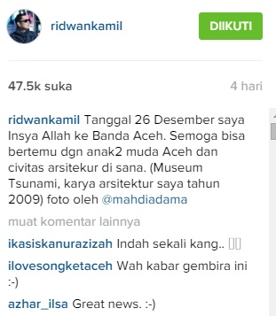 Banda Aceh - Kedatangan Walikota Bandung, Ridwan Kamil ke Banda Aceh 26 Desember 2015 disambut antusias warga. Akun instagram Ridwan Kamil ramai dikomentari warga Banda Aceh. Akun instragram rauyan79 menulis “Kami tunggu ya pak @ridwankamil di banda aceh, kami mau bapak ga balik lg ke bandung, terus bapak jadi walkot banda aceh langsung nanti,” ujarnya.