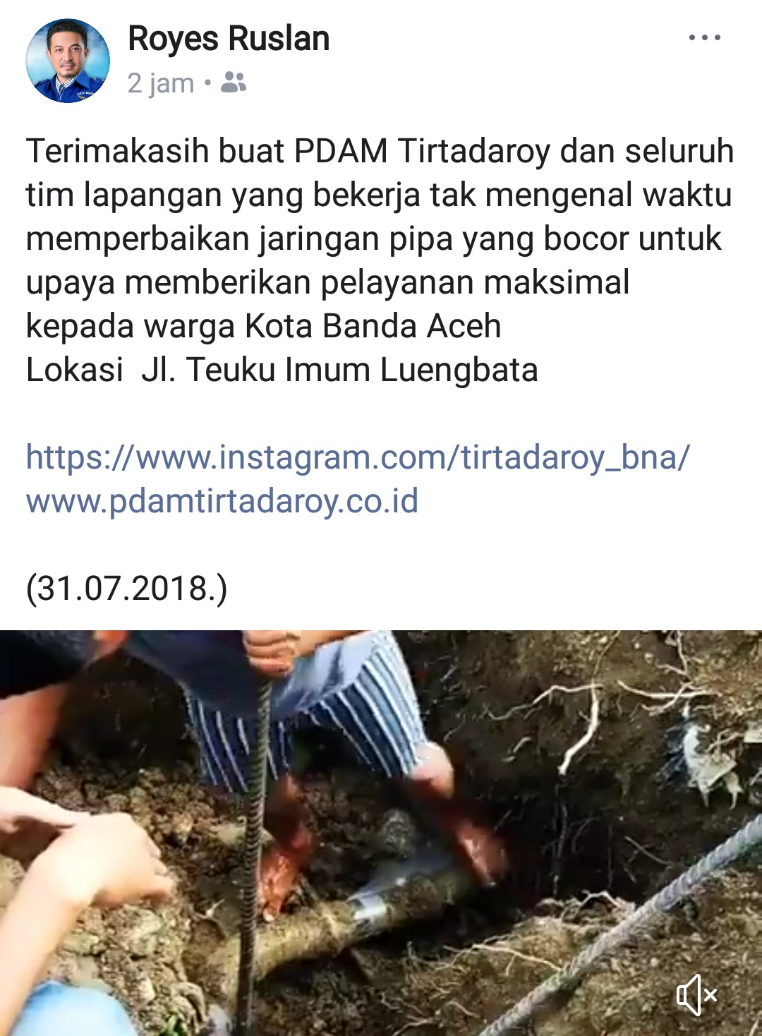 Melalui akun facebooknya, Royes memposting video petugas PDAM yang bekerja memperbaiki jaringan pipa di Jalan T. Imum Lueng Bata.
