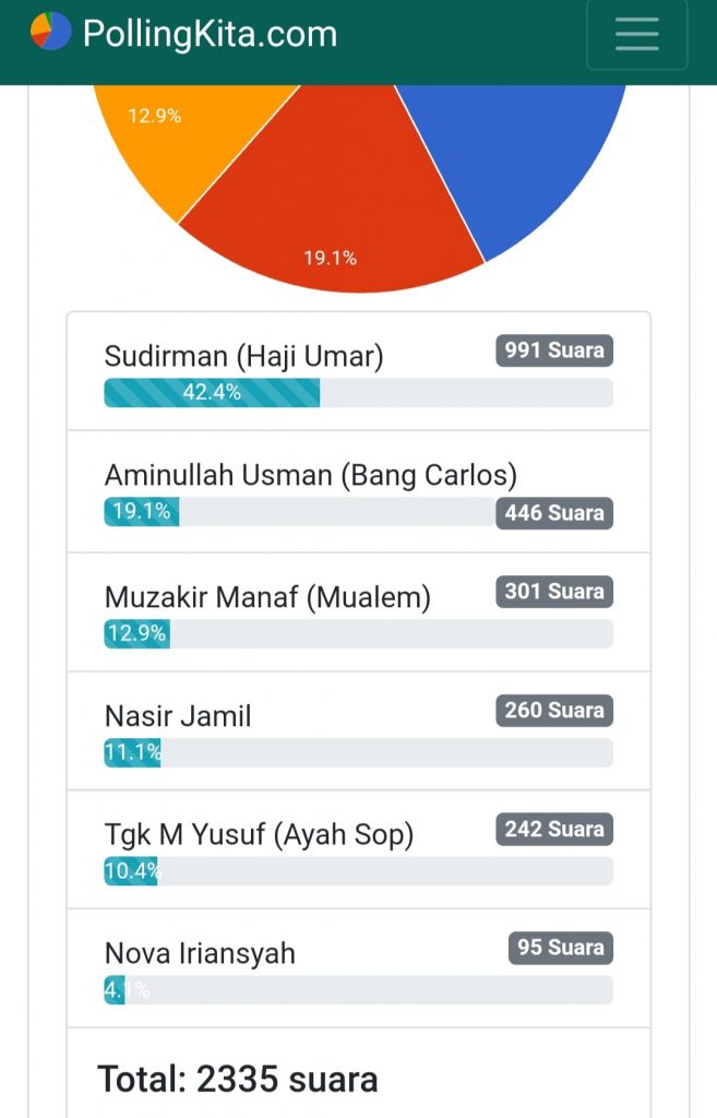 Dari data sementara, Minggu (9/2/2020) malam di situs pollingkita, nama Sudirman alias Haji Uma semakin perkasa memimpin perolehan suara. Hal ini wajar, lantaran Haji Uma sangat populer di kalangan media sosial karena aksinya membantu warga kecil.