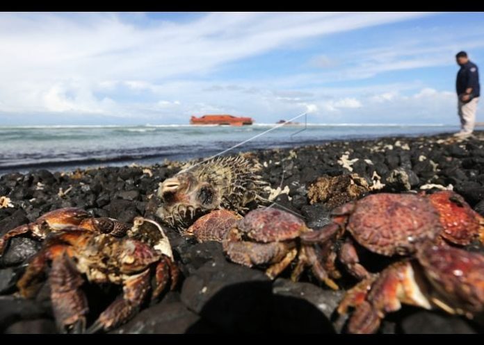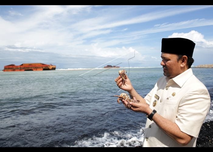 Bupati Aceh Besar Mawardi Ali mengamati kepiting laut yang mati akibat tercemar batubara yang tumpah dari kapal tongkang yang terhempas gelombang dan badai di pantai wisata Ujung Kareung, Lampuuk, Aceh Besar, Aceh, Rabu (1/8). Pemerintah setempat meminta pihak terkait untuk segera membersihkan tumpahan batubara dari kapal tongkang yang telah terbelah menjadi dua agar tidak menimbulkan pencemaran lingkungan yang lebih parah. ANTARA FOTO/Irwansyah Putra