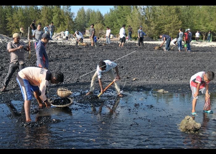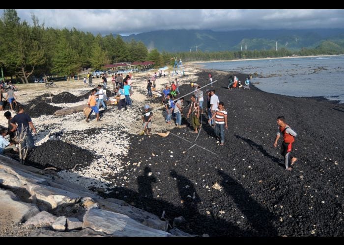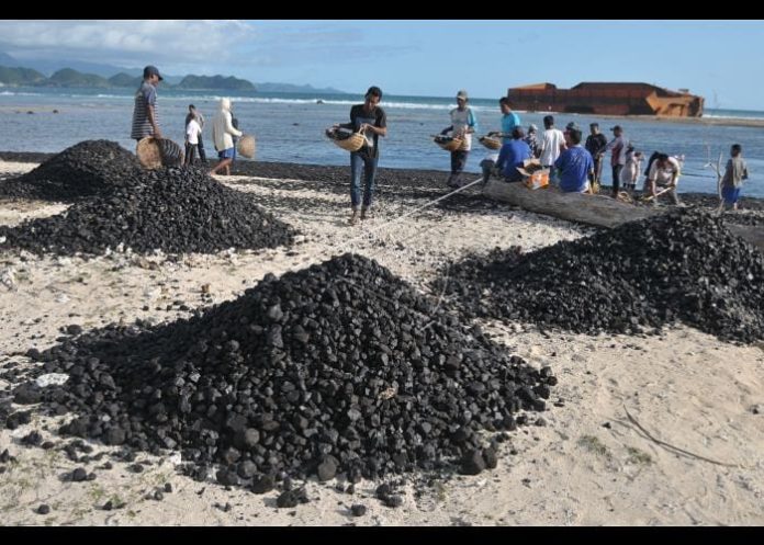 Warga bersama nelayan membersihkan tumpahan batu bara dari kapal tongkang yang kandas di perairan pantai Ujung Kareng, Lhoknga, Aceh Besar, Aceh, Jumat (3/8). Plt Gubernur Aceh Nova Iriansyah meminta perusahaan kapal tongkang yang mengangkut sebanyak 7.000 ton batu bara untuk kebutuhan PT Lafarge Semen Indonesia di daerah itu untuk membersihkan tumpahan batu bara dan memulihkan ekosistem pantai yang rusak. ANTARA FOTO/Ampelsa/aww/18.