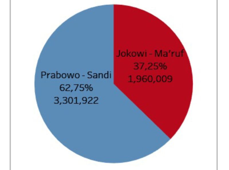 Dari total lebih 5 juta suara yang sudah masuk, pasangan Prabowo Sandi unggul 62 persen. Sedangkan Jokowi Amin hanya mendapat 38 persen suara.
