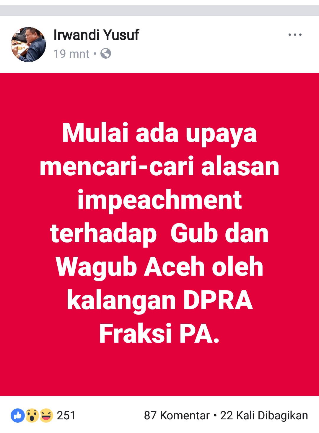 Irwandi menuliskan status di FB, Kamis (1/2) sekitar pukul 01.10 WIB. Dirinya mengatakan upaya pemecatan ini berasal dari Fraksi PA.