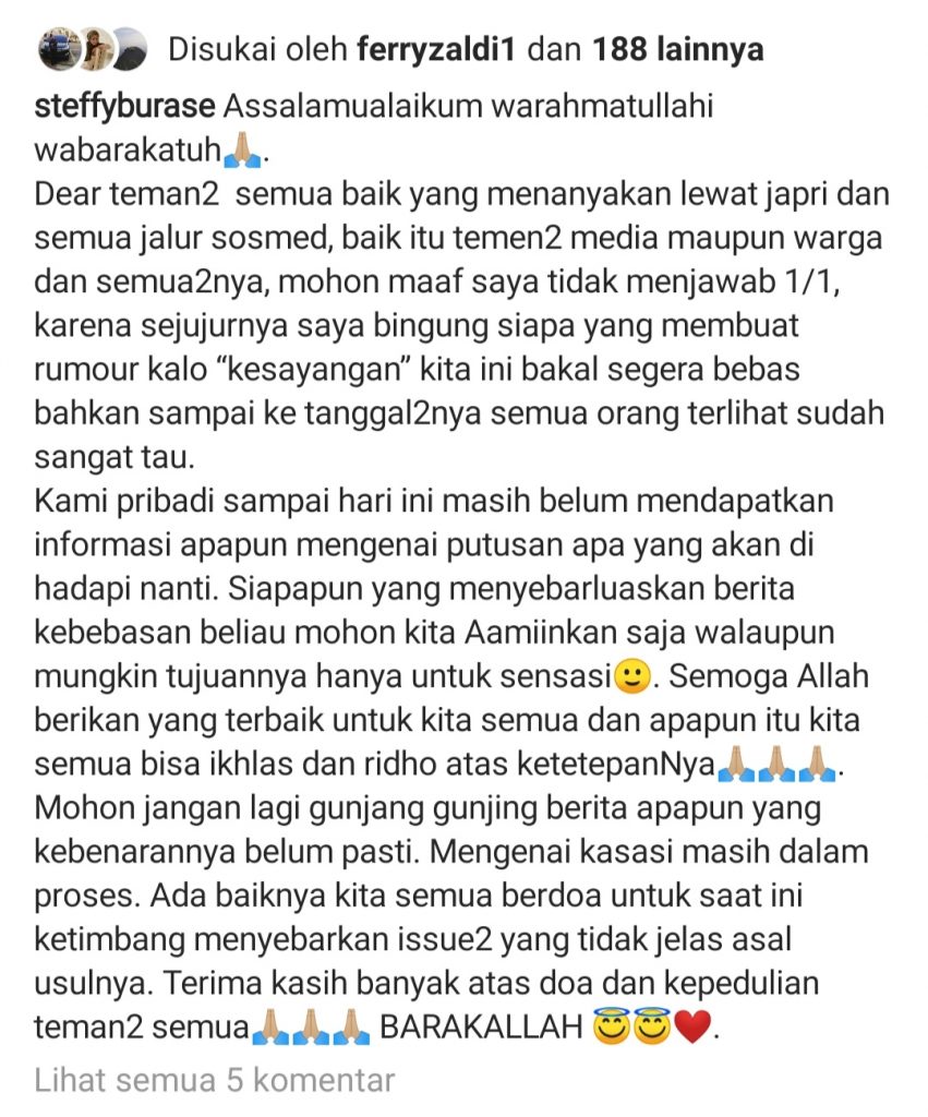 Berikut komentar Steffy Burase yang dituliskan di media sosial miliknya.
