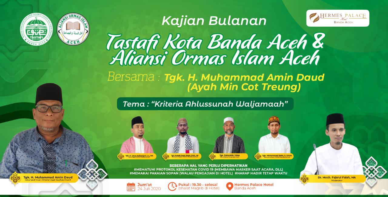 Banda Aceh – Pengurus Majelis Pengajian Tasawuf, Tauhid dan Fiqh (Tastafi) Kota Banda Aceh menggandeng aliansi ormas Islam Aceh kembali mengadakan pengajian rutin yang kali kedua di Hotel Harmes Palace. Pengajian umum kali ini mengangkat tema “Kriteria Ahlusunnah wal Jama’ah” dan akan berlangsung pada hari Jumat (Malam Sabtu) 24 Juli 2020 pukul : 19.00 WIB.