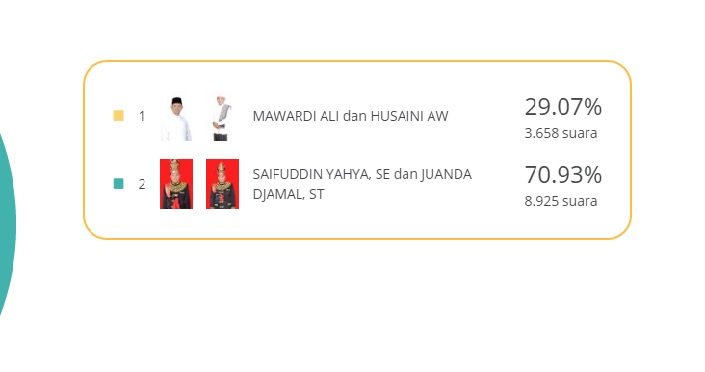 Berdasarkan situs resmi KPU, pasangan yang diusung oleh PA, Gerinda, PKS, dan Demokrat ini unggul dengan persentase 70,9 persen atau 8.925 suara. Sedangkan pesaingnya, Mawardi Ali - Husaini AW hanya memperoleh 29,07 persen atau 3.658 suara.