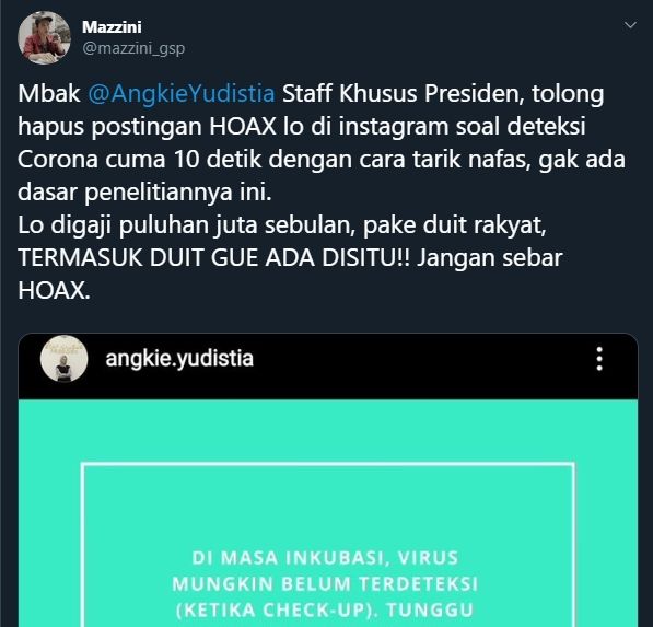 “Mbak Angkie Yudistia, Staf Khusus Presiden, tolong hapus postingan HOAX lo di Instagram soal deteksi Corona cuma 10 detik dengan cara tarik nafas, nggak ada dasar penelitiannya ini,” tulis pengguna Twitter dengan akun @mazzini_gsp, Minggu (15/03).