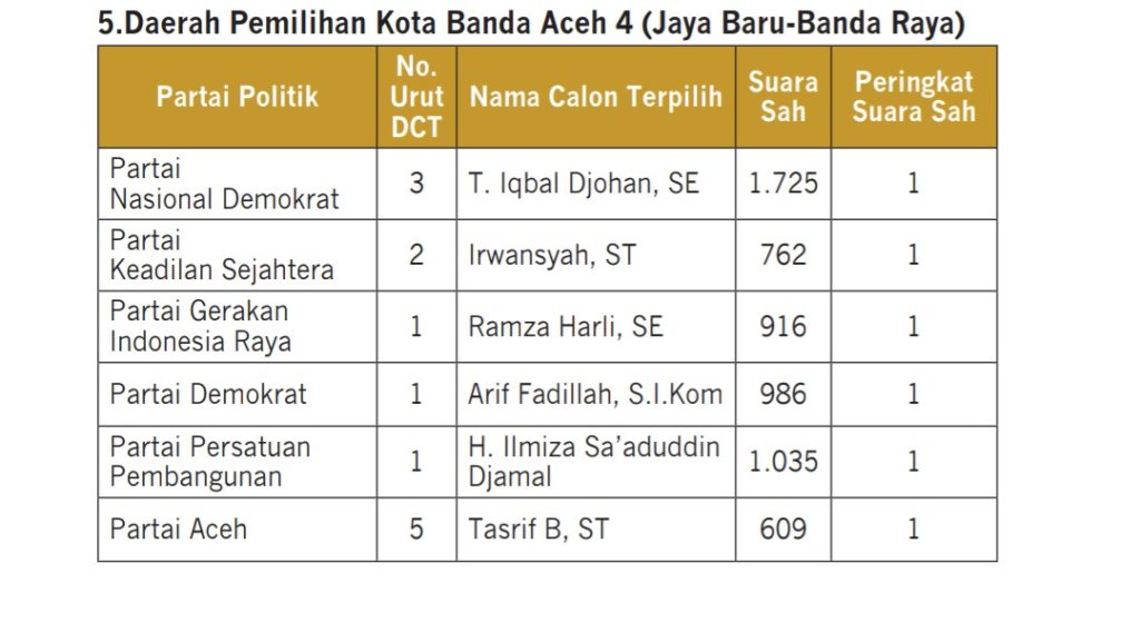 Tahun 2014 lalu, Caleg Nasdem asal Banda Raya dan Jaya Baru, Teuku Iqbal Johan mendapat 1725 suara yang merupakan satu-satunya caleg yang lolos BPP kursi se Banda Aceh.